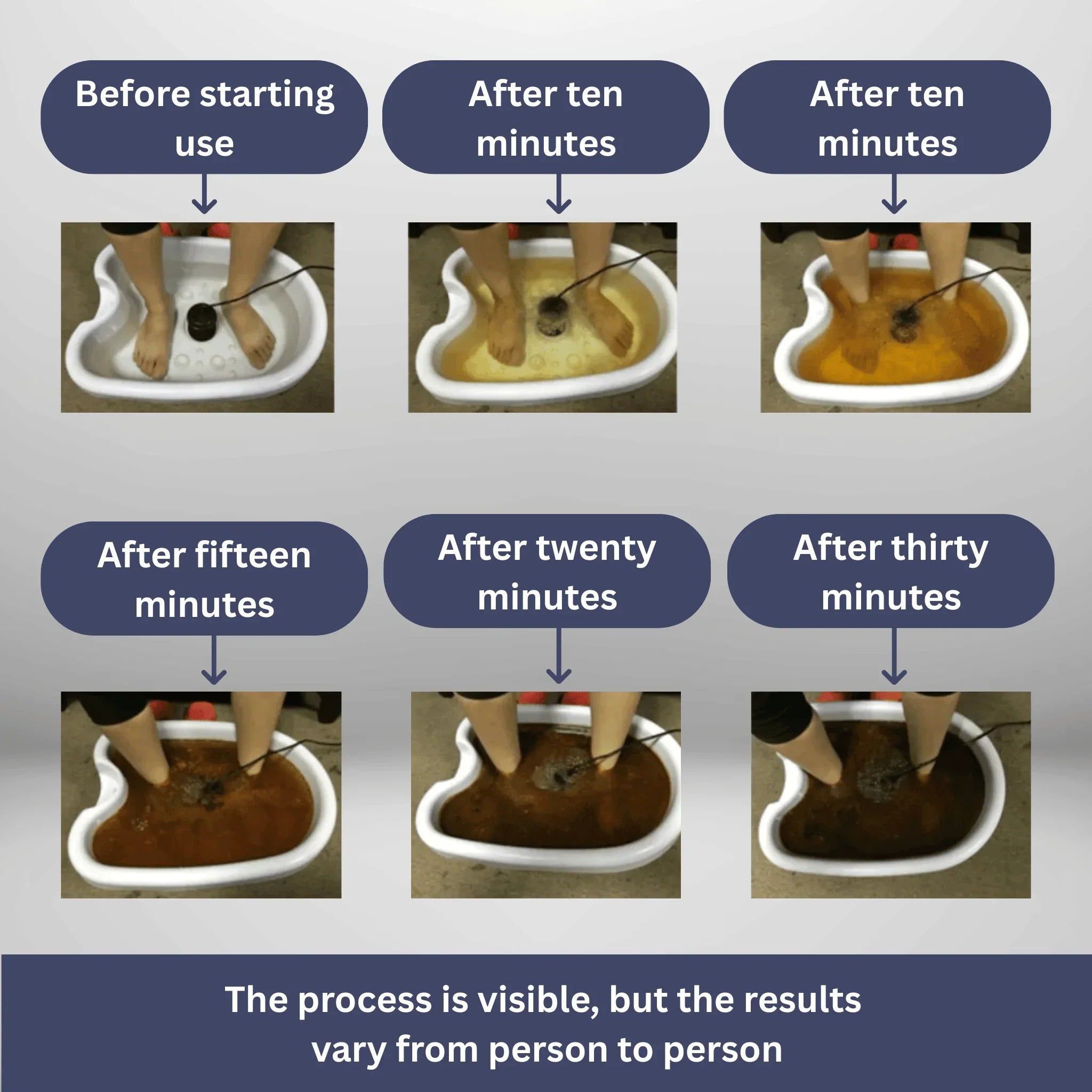 During the treatment, you can observe the process firsthand. The water changes color, bubbles and particles become visible, showing that your body is actively working.