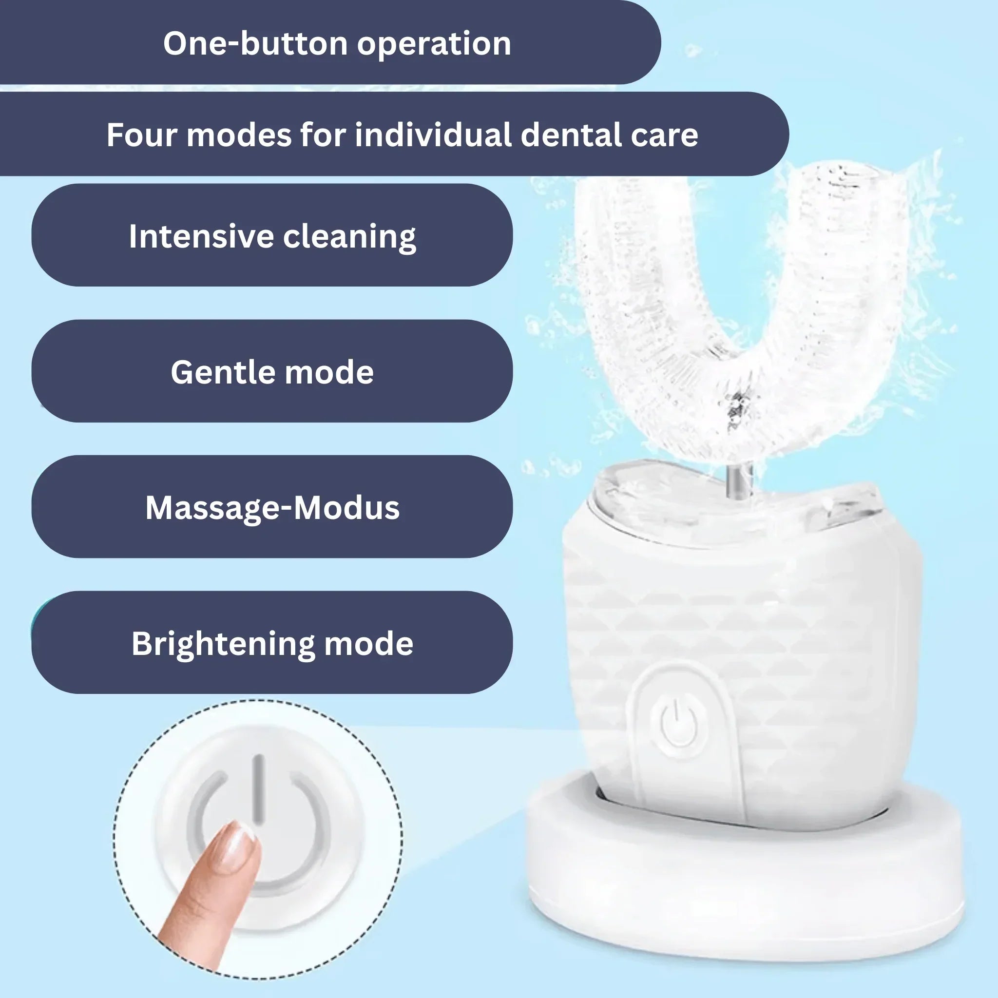 The specially designed U-shaped brush head fits precisely to your tooth shape and reaches all tooth surfaces at once.