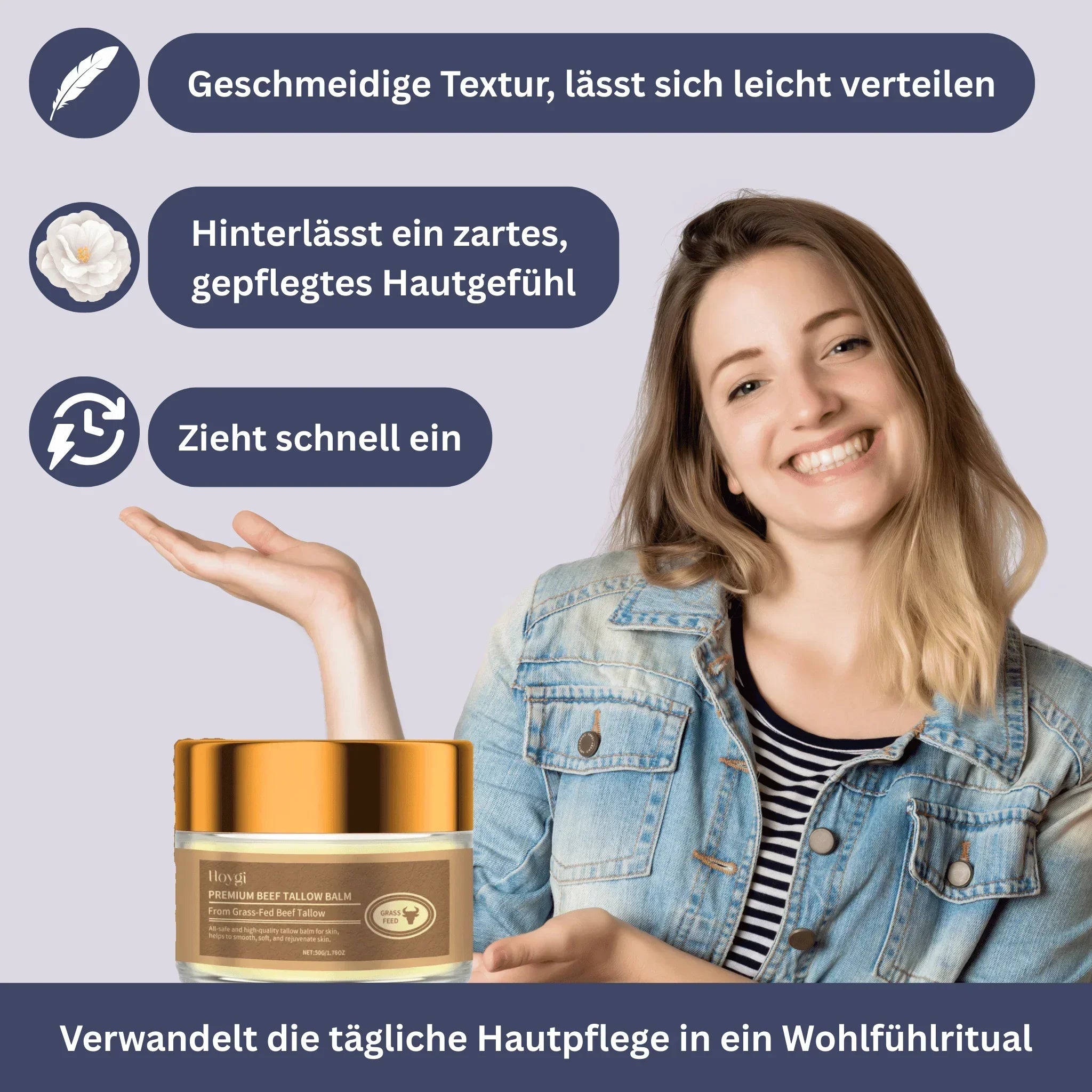 Pflege deine Haut mit dem Premium Beef Tallow Balsam von GesundPur, einer reichhaltigen und zugleich leichten Feuchtigkeitspflege aus Rindertalg aus nachhaltiger Weidehaltung und ausgewählten Pflanzenextrakten.