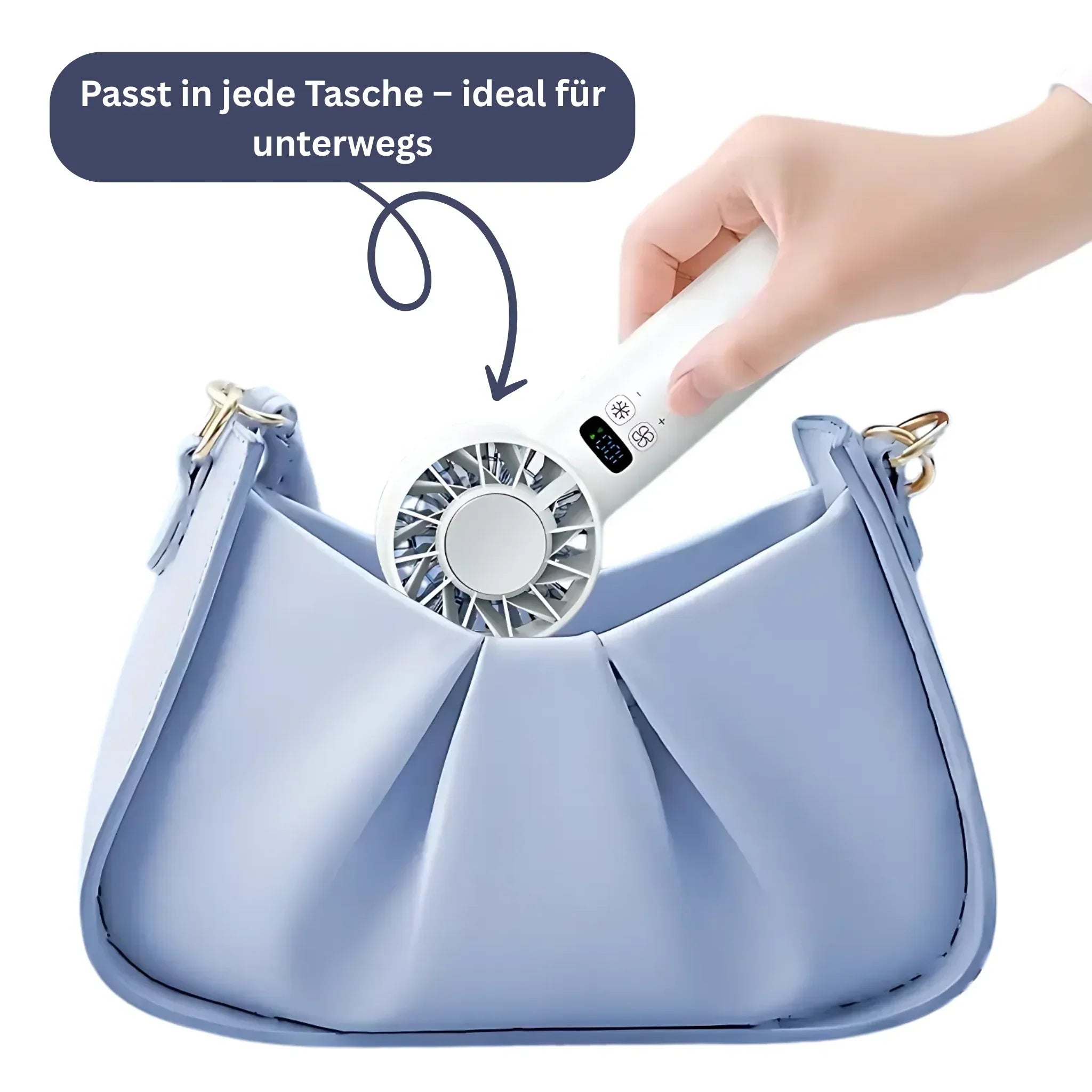 Der handliche Ventilator liegt leicht in der Hand und passt problemlos in jede Tasche.