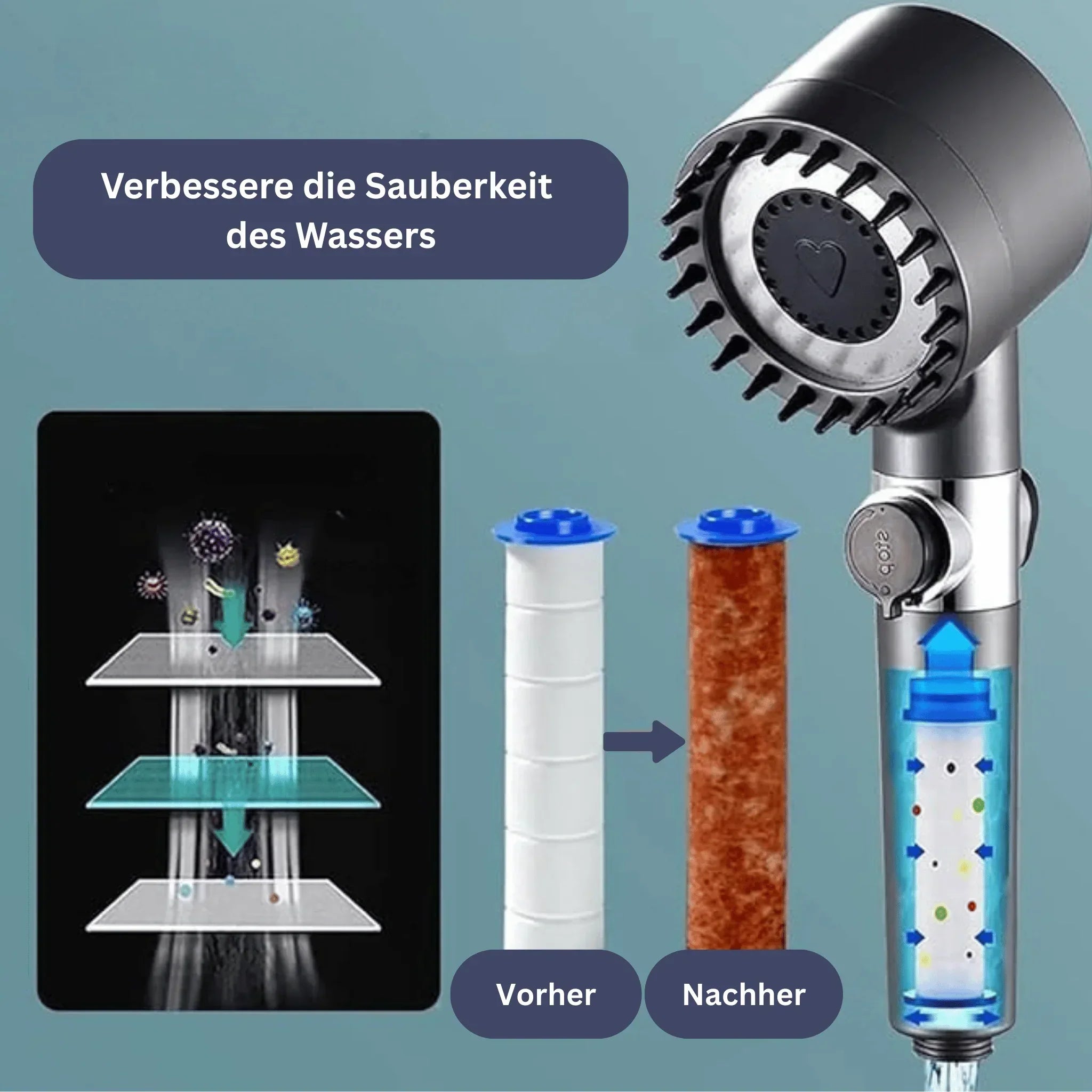 Die Filter reduzieren Chlor, Schwermetalle und Verunreinigungen – so bleiben deine Haut und Haare geschützt vor Trockenheit und Reizungen.