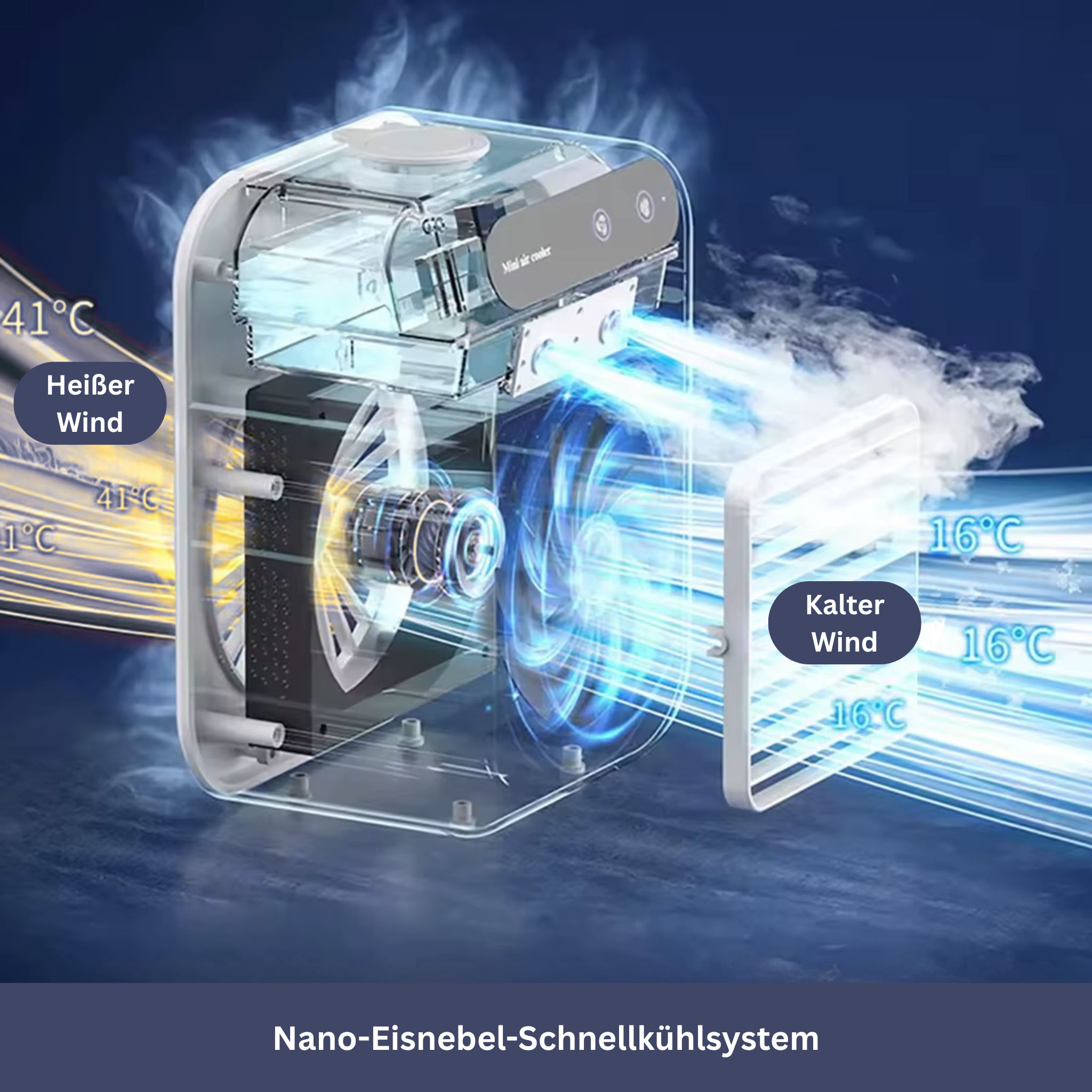 Dank der Nano Ice Nebel Technologie kann der Kühler die Lufttemperatur am Auslass um bis zu 20°C (36°F) im Vergleich zur Raumtemperatur senken.